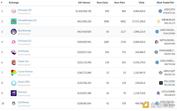 过去24小时去中心化交易所的交易量 数据来源:Coingecko