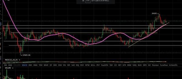 大饼昨日多次试探23000关口未能突破,随后承压回落,低位跌至22300一线,恭喜跟上昨日思路的朋友空单获利600余点,晚间行情止跌反弹一路上行,目前币价在22900附近震荡,小时级别来看,高位连续收了四根阴线,上涨行情表现乏力,附图中KDJ三线高位超买区聚合有向下发散的需求,MACD快慢线向上发散,红色能量柱有缩量迹象,RSI三线中轴横盘,四小时来看高位收阴线,MACD快慢线向下散,红色能量柱缩量运作,综合来说后市建议高空操作为主,23200-23400空,目标22600-22300