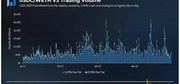 如此前所述,1bps费用等级的引入使得Uniswap的稳定币兑换池具有竞争力。不过,二季度USDC/USDT交易量下降了17.4%。值得注意的是,由于UST脱钩引发的市场恐慌蔓延至USDT,在此期间的高成交量可能来自那些寻求兑换为USDC的用户。
