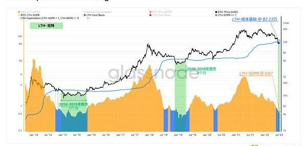 长期持有者成本基础指标?估计长期持有者为他们的比特币支付的平均价格。因此,由于市场估值低于长期持有者的成本基础时,我们可以认为这群人总体上处于损失中。同样地,目前LTHs平均处于浮亏状态下,持有的未实现损失总额为-14%。