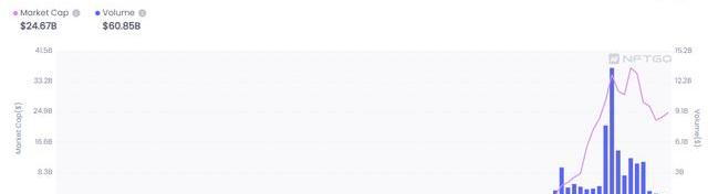从2021年的上半年开始,NFT板块的总市值开始爆发式增长,各类NFT项目入“雨后春笋”般涌现。根据NFTGO数据显示,从2021年的1月NFT板块总市值仅为7000万美元左右,而在2022年的2月,该数据达历史顶峰,短短一年时间突破了350亿美元,这意味着NFT在2021年接过了DeFi的热度大棒,一跃成为最受欢迎的投资品。