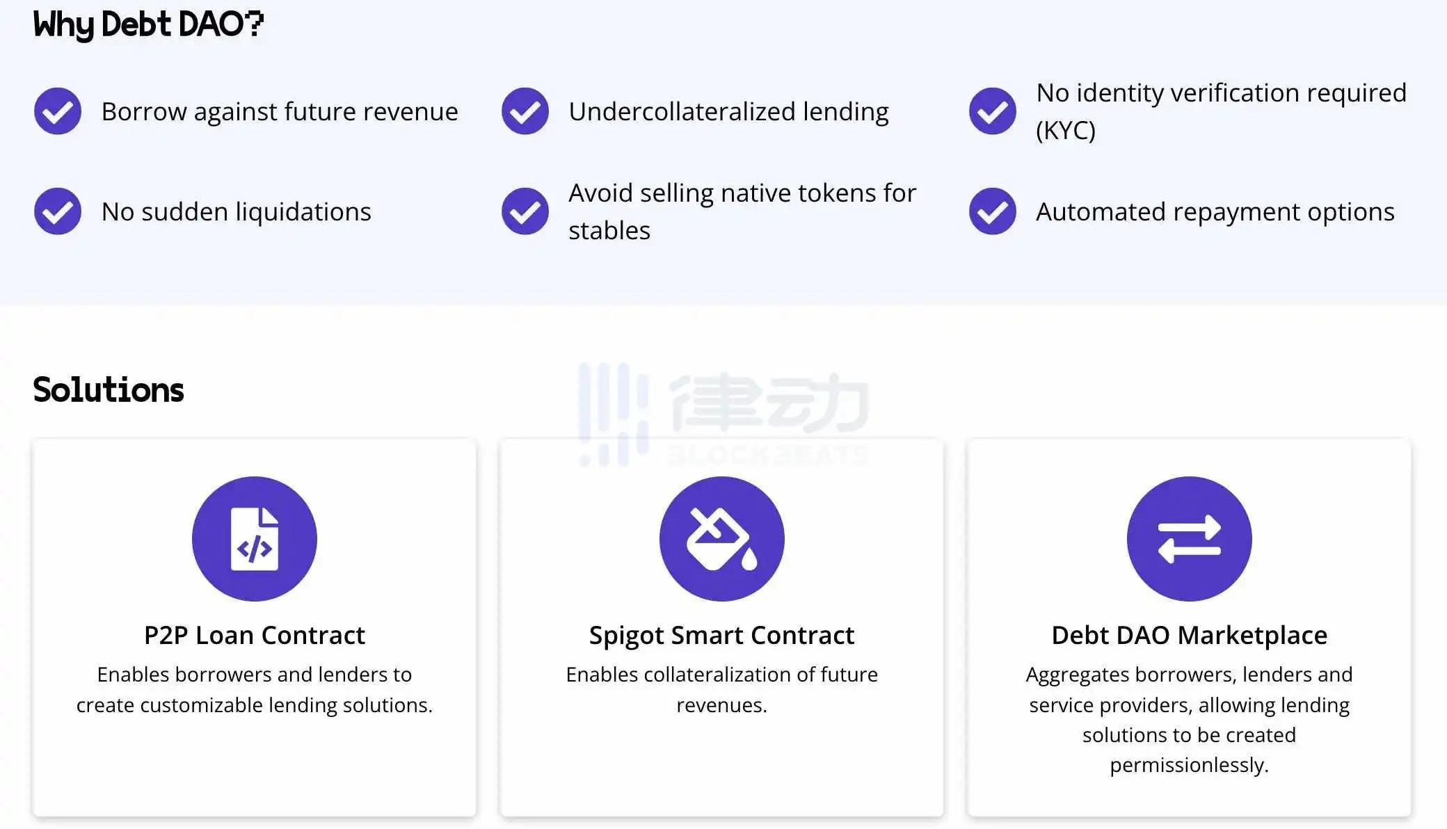 DebtDAO也提供非足额抵押贷款服务。他们的方法是为借贷双方提供基于收入的融资合约。借款人的产品或服务所产生的收入将自动偿还其贷款产生的本息。