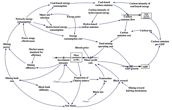 近年来,基于系统动力学(SD)的模型被广泛应用于某一特定领域或行业的碳排放流量估算,在这基础上,研究人员开发了比特币区块链碳排放模型(BBCE),以评估不同情景下中国比特币网络运营的碳排放水平。