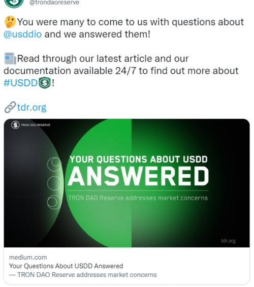 7月19日,波场联合储备的官方推特发表公开信,针对近期市场对USDD的提问作了系统的阐述,重申了USDD的流通和使用不受制于任何中心化机构,并强调了面对市场上的做空行为,波联储始终采取市场化的手段与方式来维护USDD币值稳定。