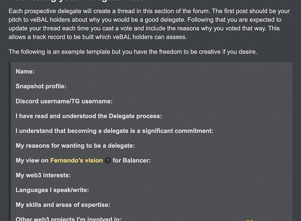 任何人都可以成为代表。协议的申请涉及填写由特定DAO提供的模板,例如下面看到的Balancer申请模板。这些申请可能是模糊的,但有些申请,例如Balancer,存在需要对协议及其愿景进行进一步研究的问题。
