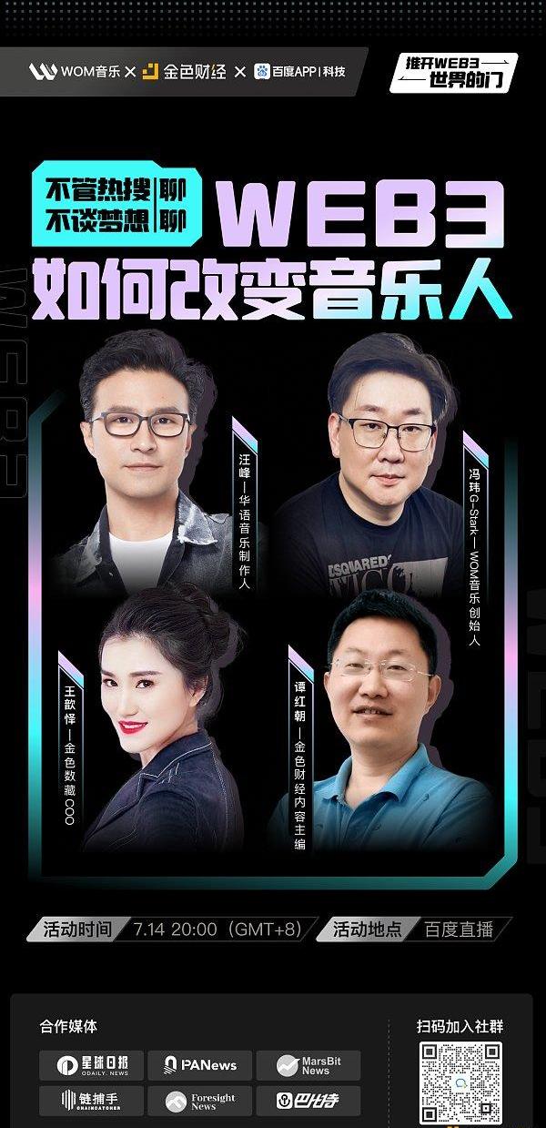 本期嘉宾为华语音乐制作人汪峰、Wom音乐创始人冯玮、金色数藏COO王歆怿、金色财经内容主编谭红朝。