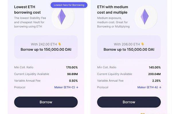 MakerDAO提供两款产品:超额抵押贷款和稳定币$DAI。与AAVE和Compound一样,MakerDAO是一个DeFi借贷协议。借款人存入符合条件的加密抵押品,例如$ETH,MakerDAO将发放$DAI计价的贷款。MakerDAO提供具有不同抵押率和借贷利率的产品,如下图所示,需要170%较高抵押率的$ETH借贷产品提供0.5%的较低利率,需要145%较低抵押率的产品则需支付更高的2.25%利率。