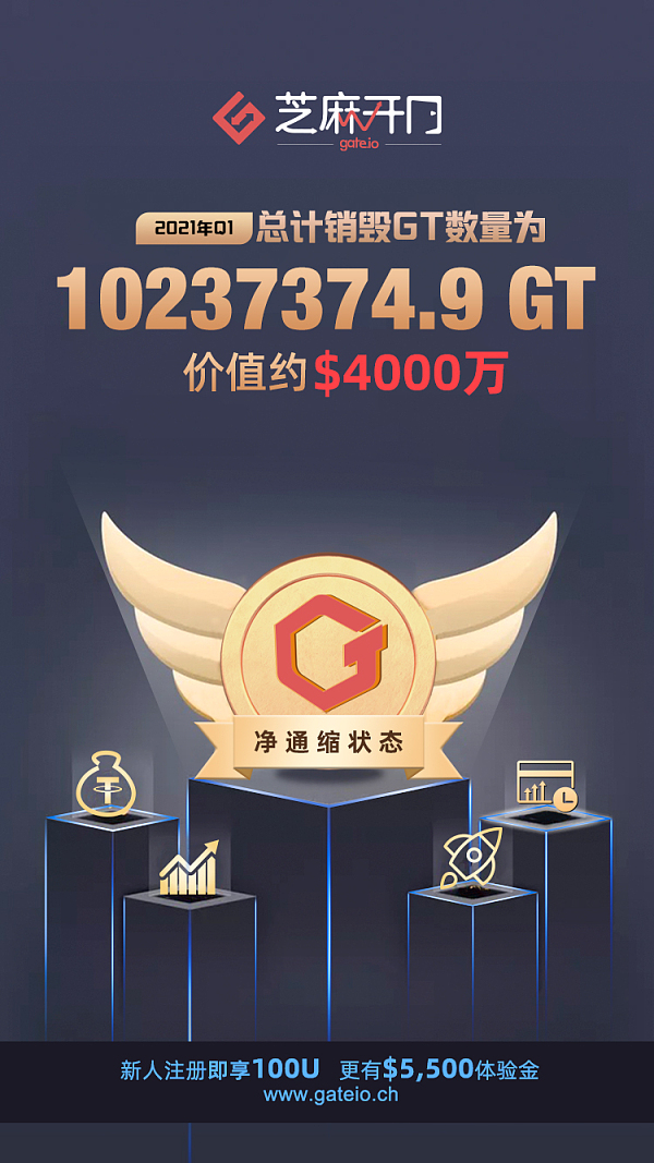 根据Block.info显示,Gate.io芝麻开门平台币2021年Q1销毁10237374.905268 GT,价值约4000万美金,占比GT当前流通量的7.5%。