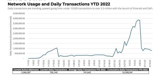 3月份,Oasis共识层由15.3万个活跃地址组成,总共处理了700万笔交易。今年推出的EmeraldParaTime单日交易量高达380万笔,平均每天交易量约为65万笔。