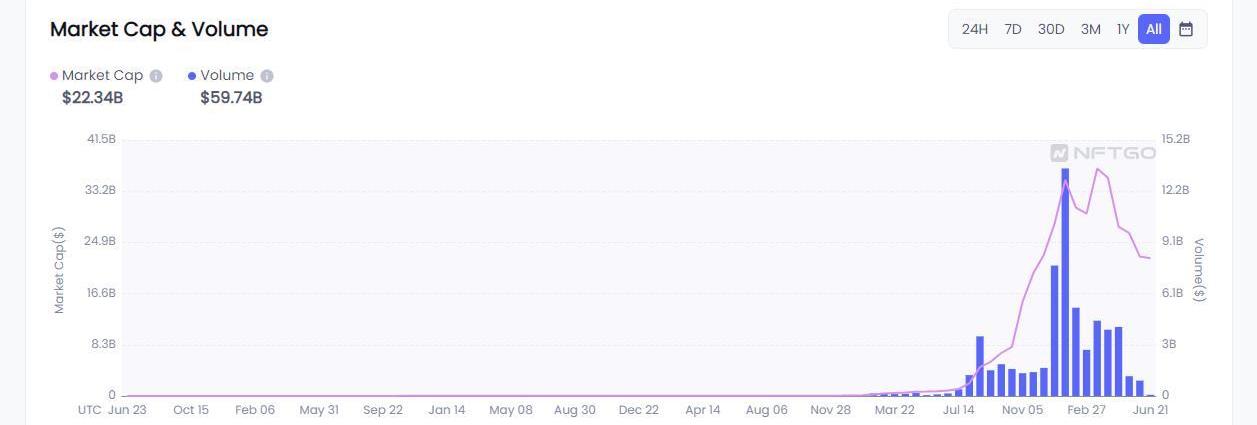 从2021年的上半年开始,NFT板块的总市值开始爆发式增长,各类NFT项目入“雨后春笋”般涌现。根据NFTGO数据显示,从2021年的1月NFT板块总市值仅为7000万美元左右,而在2022年的2月,该数据达历史顶峰,短短一年时间突破了350亿美元,这意味着NFT从2021年接过了DeFi的热度大棒,一跃成为最受欢迎的投资品。