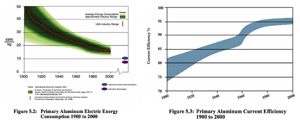 铝在以前也是有具有富余可再生能源的国家(比如冰岛) “出口” 电力的常用手段。冶炼铝土矿(bauxite,也即是铝矿石)需要消耗巨大的能量,而且这种转化是单向的(是不是跟哈希函数很像?)。围绕着铝的 “反常的” 能源消耗,同样的担忧已经持续有 40 年了,从?1979 年就开始了(也包括对中心化的担忧)。但所有此类企业都在这颗星球上不断寻找便宜的能源和优惠政策。因为铝制造业已经发展了几十年了,所以每千克铝所消耗的电力度数也在不断降低。