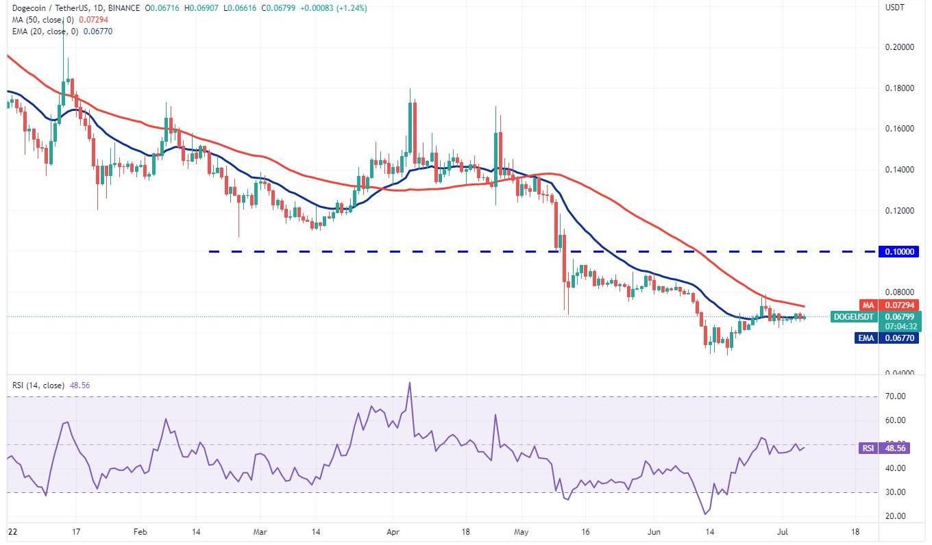 ShibaInu(?SHIB?)于7月5日突破50日均线(0.000010美元),但烛台上的长灯芯表明空头正在以较高水平卖出。一个小的积极因素是多头不允许价格回落至0.000010美元以下。