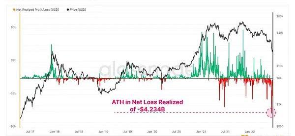 净实现利润/亏损指标反映了投资者在任何一天花费的代币所促成的净资本流动状况。最近价格暴跌至?2?万美元的区域,其间出现了历史上以美元计价的最大每日实际损失。投资者在一天内共锁定了?-42.34?亿美元的亏损,较?2021?中期创下的?34.57?亿美元的纪录增长了?22.5%。