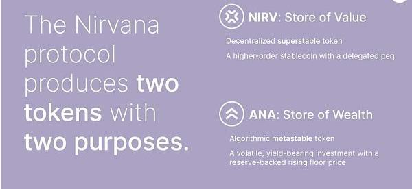 Nirvana项目采取双币系统:ANA是一种算法亚稳态代币,用作财富存储;由ANA作为抵押生成的NIRV代币,是一种去中心化的超级稳定币,用作价值存储。ANA和NIRV的关系就好比LUNA和UST,ANA的估值会随着NIRV需求的增长而增加。