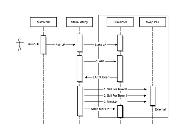SIL?Master为入口管理合约,处理交易和 SIL Token 的分发。Match?Pair 负责配对,配对队列采用先进后出的模型, 保证先充值的用户优先配对。当配对方撤出资金提现时候, 解队队列采用后进先出模型,同样确保优先充值的用户,处于相对安全的队列位置。Stake?Gatlin负责将配对的 LP抵押给挖矿合约, 并根据配置策略,自动进行利滚利,CLAIM收益,并将CLAIM的收益通过Swap/Mint 转换为LP,重新抵押获取收益, 保证利益最大化。