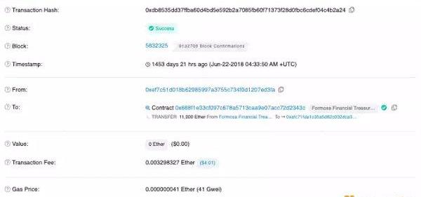 在FMFIC0的三周后,宝岛金融项目的状况急转直下,2018年6月22日,FormosaFinancial的项目金库钱包被两次提取了各11,000ETH。投资者不知道的是,共同创办人谢国梁以该公司的唯一董事的身份,自行推动了双边股票回购行为。