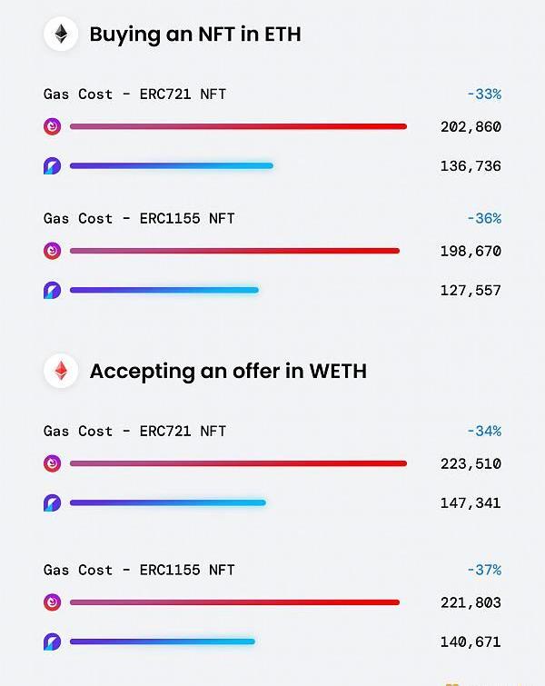Seaport协议开发人员会在Assembly虚拟机中工作以优化事务效率。下表总结了不同类型交易的gas节省。