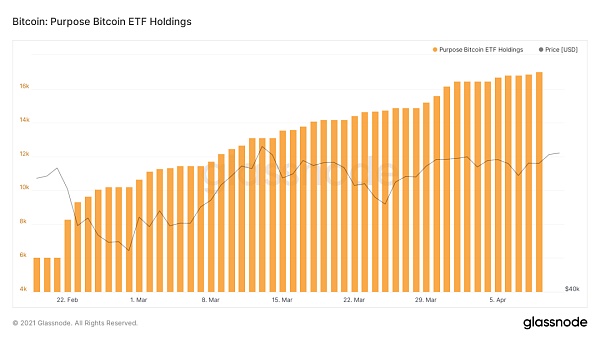 根据Glassnode数据,截至2021年4月10日,加拿大Purpose Bitcoin ETF持有的比特币数量已经达到17013枚,增长速度惊人。