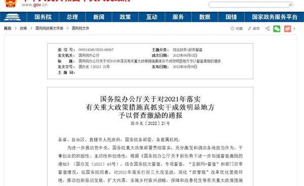 6月9日,国务院办公厅发布《国务院办公厅关于对2021年落实有关重大政策措施真抓实干成效明显地方予以督查激励的通报》,对199个地方予以督查激励,相应采取30项激励支持措施。