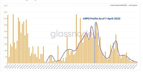 下图是4月1日的概况,并用今天的URPD来覆盖它。由此我们可以评估coin分布的变化并做出以下观察: