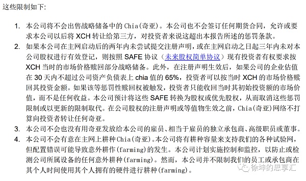 Chia商业白皮书中披露“自成立以来,公司已经通过 SAFE 协议筹集了约 1600 万美元资金。这些资金主要分三轮,有三种不同标准的价格上限,和转换功能。最后一轮 500 万美元的融资已于 2020 年 8 月完成。没有向任何投资者被承诺以 chia 作为投资回报。某些投资者拥有赎回权,如果公司在上述特定时间段内未将股权上市公开交易,则将以 Chia(奇亚)币的当时价格计价。本公司预计将这些 SAFEs 转换为股权或优先股权,并且不打算在本公司股权注册声明生效前向投资者提供 XCH。”