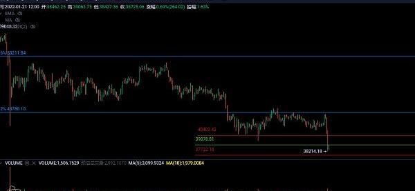昨日美股冲高回落,BTC也紧随其后大幅下挫,最低跌至38200美金止跌回升,月线关键支撑38900美金暂时跌破,后面关注本月收线能否站回,去年519大跌后的3个月筑底期间均未有效跌破中轨线支撑.
