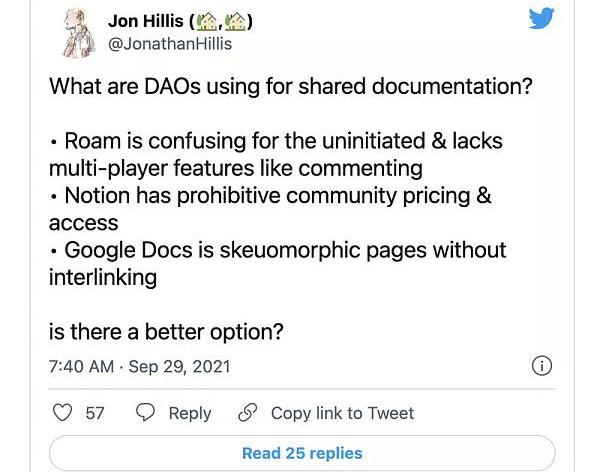 文档和团队知识管理工具是DAO的一大痛点。目前还没有可行的基于web3原生的解决方案,所以我们只能使用常见的web2技术工具:Notion、GoogleDocs和Roam。