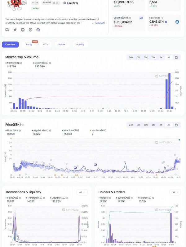 此外,下图是TheHeartProject过去24小时内的价格变化图,平均价格上涨了11.3%。尽管地板价下降的幅度超过了这个幅度——表明地板价与项目中的其他事件之间存在巨大差距,仅仅透过地板价数据一个维度有时会产生误导。通过将所有必要数据合并到一张图表中的清晰图表,可以在价格趋势中发现更多的东西。根据NFTGo.io价格多维走势图,当地板价下降过程中,平均价格依旧上升,同时有活跃的高价NFT成交,这会预示一个较好的势头。