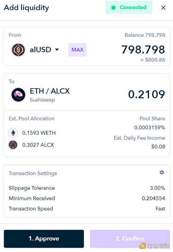 与alUSD资金池一样,这样也能够产生ALCX,而且ALCX随时可以提取。