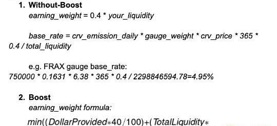 Boost机制。Boost是流动性挖矿的加速机制,在没有boost的情况下,流动性挖矿的基数只有40%,通过足够拥有足够量级的veCRV的情况,才能获得Boost倍速的增加,最高2.5x,是一个线性增加的机制。具体算法可以参考下图的公式: