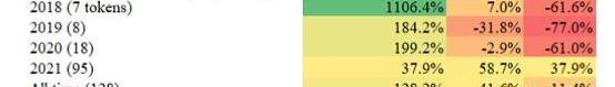 参与这些网络的发展。但现实表明,大部分回报在上市后很早就出现了——2021年的币表现不错,但2020年及更早的一切都表现不佳!!这说明了什么?2021年的回报率也低于Messari引用的91%的流行率,这表明在暴涨之后他们都失去了价值。