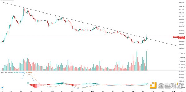 EOS/BTC走势也是放量突破长期压制线,趋势反转后续也有望走出跑赢大盘的走势,短期支撑8.8美金,趋势支撑7.9美金,一旦回落,逢低布局为主。