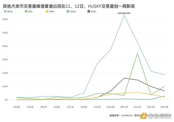 此番犬类Meme Coin的币价上涨表现出了高度的量价一致性,各种犬类币的交易高峰也出现在5月11日和5月12日。其中,5月11日,AKITA交易量达到6.29亿美元左右,是近一周犬类Meme Coin中单日交易量最多的一个代币,但与SHIB相比,其交易规模仍然十分小,交易量峰值只相当于SHIB交易量峰值的4.33%左右。另外值得注意的是,5月14日,ELON和HUSKY的交易量有明显的回升,距5月13日分别上涨了约177.13%和1165.01%。