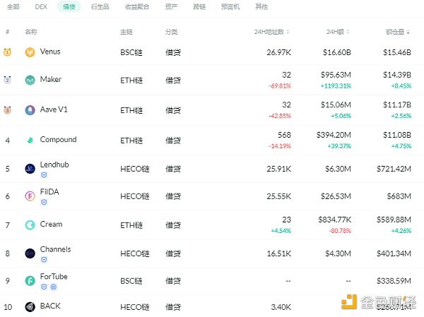 锁仓量排名前十的借贷平台 排名来源:DeFibox