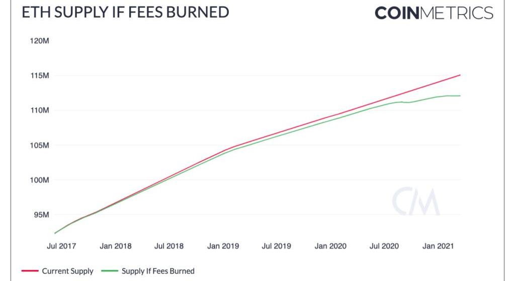 上图显示了ETH当前的供应量与交易费销毁时的供应量对比。这是对EIP-1559执行后的简化模型预测。总体来看,在EIP-1559推出之后,供应通胀将放缓。