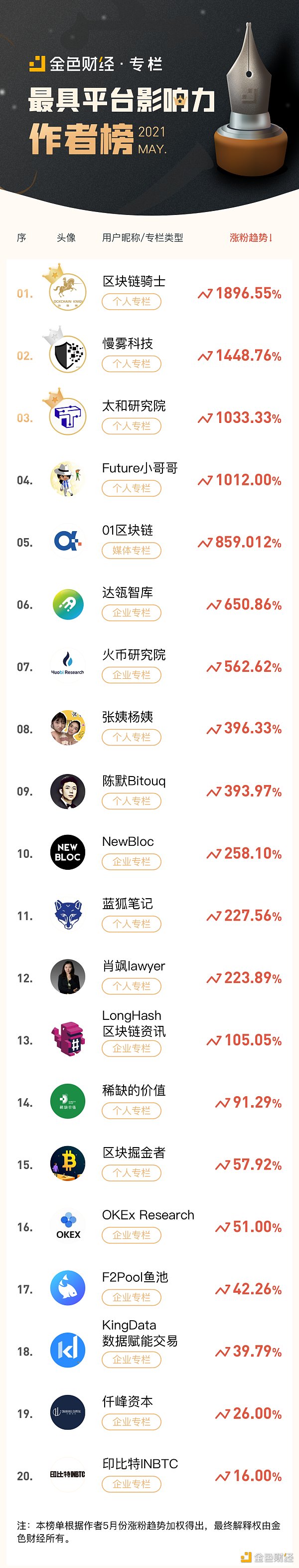 以下为5月「金色财经最具平台影响力作者榜」完整榜单: