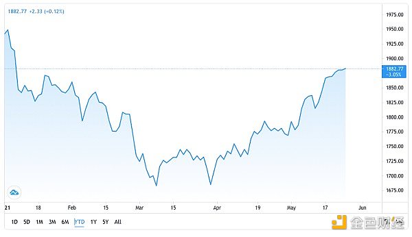 金色财经 区块链5月25日讯??自五月中旬加密货币市场出现暴跌之后,黄金价格出现明显回升。根据TradingView数据,本周二黄金价格持续小幅上涨,并于美国东部时间凌晨3:00达到每盎司1,887美元高点。