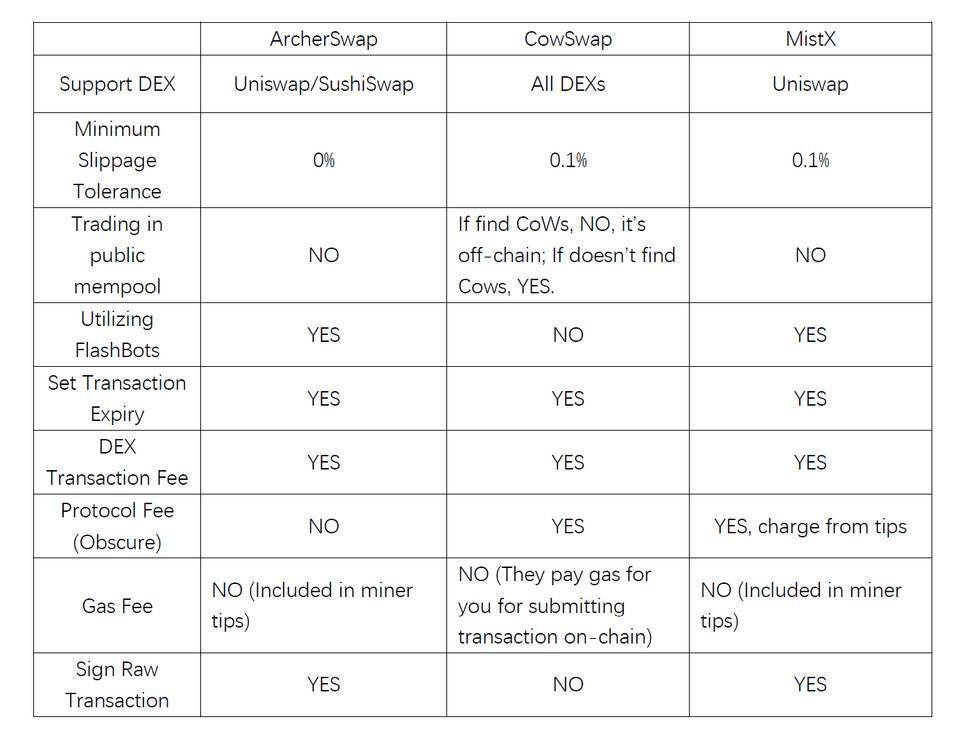 我画了一张表格,将抗 MEV 型 DEX 的核心特征记录下来,让读者更好地了解它们的异同。