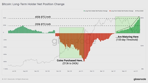 下图是将155天前的价格范围(1.3万美元到4.2万美元)映射到今天到期的那些加密货币的加速率上的标记。这表明,在早期的牛市中,有大量的加密货币被购买,并且基本上没有卖出。目前的成熟率超过40万个BTC/月,这比我们估计的在5月投降事件中出售的约16万个BTC要大得多,其中大部分是STHs。