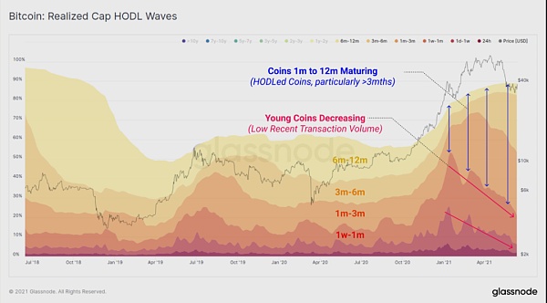 我们也可以在变现上限HODL波中看到这种加密货币的成熟,它呈现了构成变现上限的加密货币供应的相对比例。我们不仅看到非常年轻的加密货币(<1个月大)由于最近链上交易量低而下降,我们还看到年龄在3个月到12个月之间的加密货币的份额在扩大。这些都是那些在2020年至2021年1月的整个牛市中积累的HODLed币。