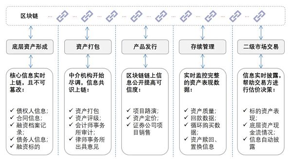 从底层资产形成角度看,ABS原始权益人可以将分布式账本作为数据承载平台,按照数据披露以及信息披露要求连接权益人及相关服务主体,将底层交易信息及资产信息储存至区块链平台,通过多方验证进行公信后,记录在分布式账本上。
