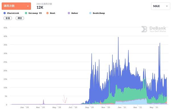 以 2020 年 6 月 1 日计,当日预言机调用的次数为 72 次,而最高峰是 2020 年 12 月 18 日,当日预言机调用的次数接近 4 万次,半年时间增长超过 500 倍。