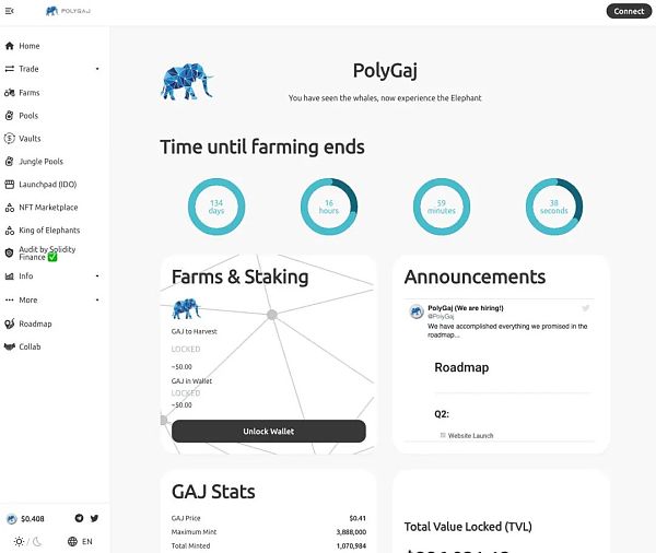 PolyGaj是一个建立在 Polygon链上的DeFi协议。 最初PolyGaj只是BSC链上Goose Finance的仿盘(fork),随着不断优化,目前已正常运行79天,总流动资金已达500万美金。