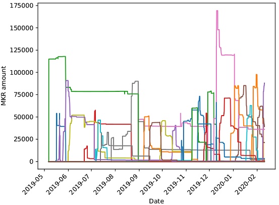 Maker及其Dai稳定币是以太坊上最受欢迎的去中心化金融(DeFi)项目,智能合约锁定了约7亿美元。Maker协议依赖于智能合约中编码的治理流程。MKR代币持有人可以投票替换现有的治理合约,投票与MKR的持有量成正比。MKR代币的总数约为987530 ,其中选定的钱包或合约持有大量代币:
