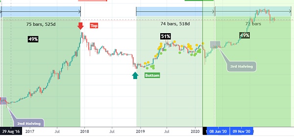该指标显示,前面几轮牛市都有一个共同点:从底部到减半阶段占整个牛市周期的51%,而其余阶段(从减半到顶部)占49%。