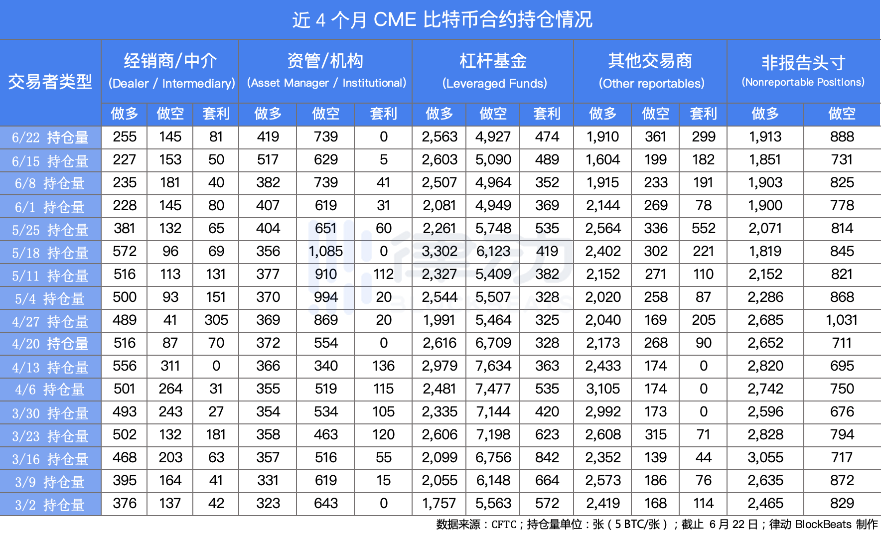 CFTC 将参与 CME 比特币期货合约的用户分为「经销商/中介 (Dealer / Intermediary)」、「资管/机构 (Asset Manager / Institutional)」、「杠杆基金 (Leveraged Funds)」、「其他交易商 (Other reportables)」、「非报告头寸(Nonreportable Positions)」五大类。经销商/中介一般指银行、经纪商;资管/机构一般指对冲基金、交易平台买卖基金;杠杆基金一般指规模较小的私募基金;其他交易商一般指资金量较大的大户;非报告头寸则是指资金量小的散户。
