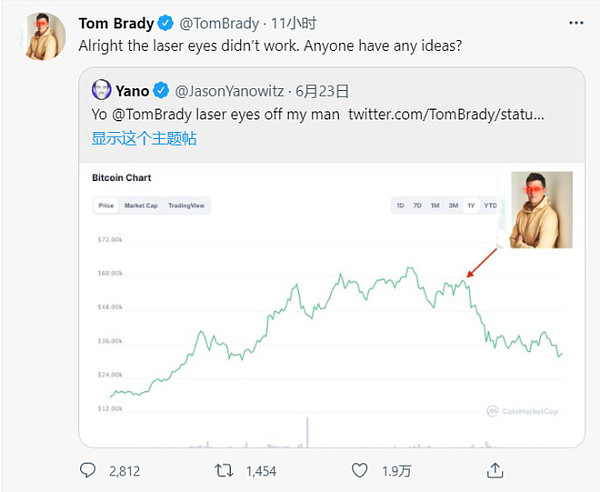 3.美国橄榄球巨星Tom Brady承认其“激光眼”对比特币交易不起作用;