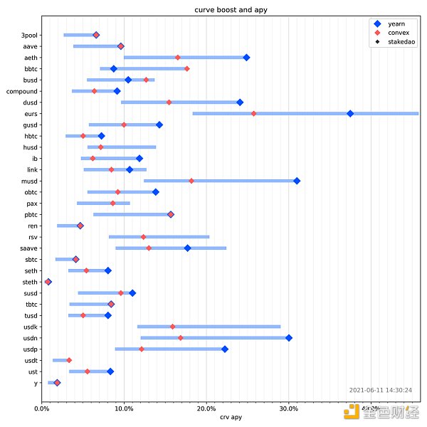 所有三个协议的收益率都保持强劲,每个协议都提供了具有较高回报的特定池。Convex在许多稳定币中处于领先地位,Yearn在其他稳定币中保持领先。StakeDAO目前仅在EUR上处于领先地位,为领先的EUR稳定币提供最高的收益率。10-30%以上的稳定币收益率在三个平台都很常见。