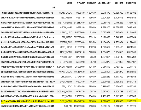 根据费用/成交量比率的前20最佳资金池如下所示。这些池子的规模相当小,最多只有几百万美元的资产。他们的回报将受到更高gas费和资金池新进者风险的影响。此外,其中许多涉及信誉较差的小币种,如FEI,FRAX ...