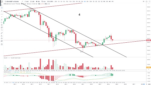 4小时级别,昨日突破前期触及498美元回落的下降通道后,迎来了快速拉升,反弹接近30日均线,量能跟不上,今日跟随大盘回落,5日和10日线依旧处于下行的姿态,其余中长期均线向上势头放缓,成交量持续萎缩,日线整体仍处于趋势通道内,MACD红柱逐步缩短,近期价格沿趋势线震荡整理的概率大,技术上只要不有效跌破趋势线,现货持有为主,支撑373美元,压力410美元。